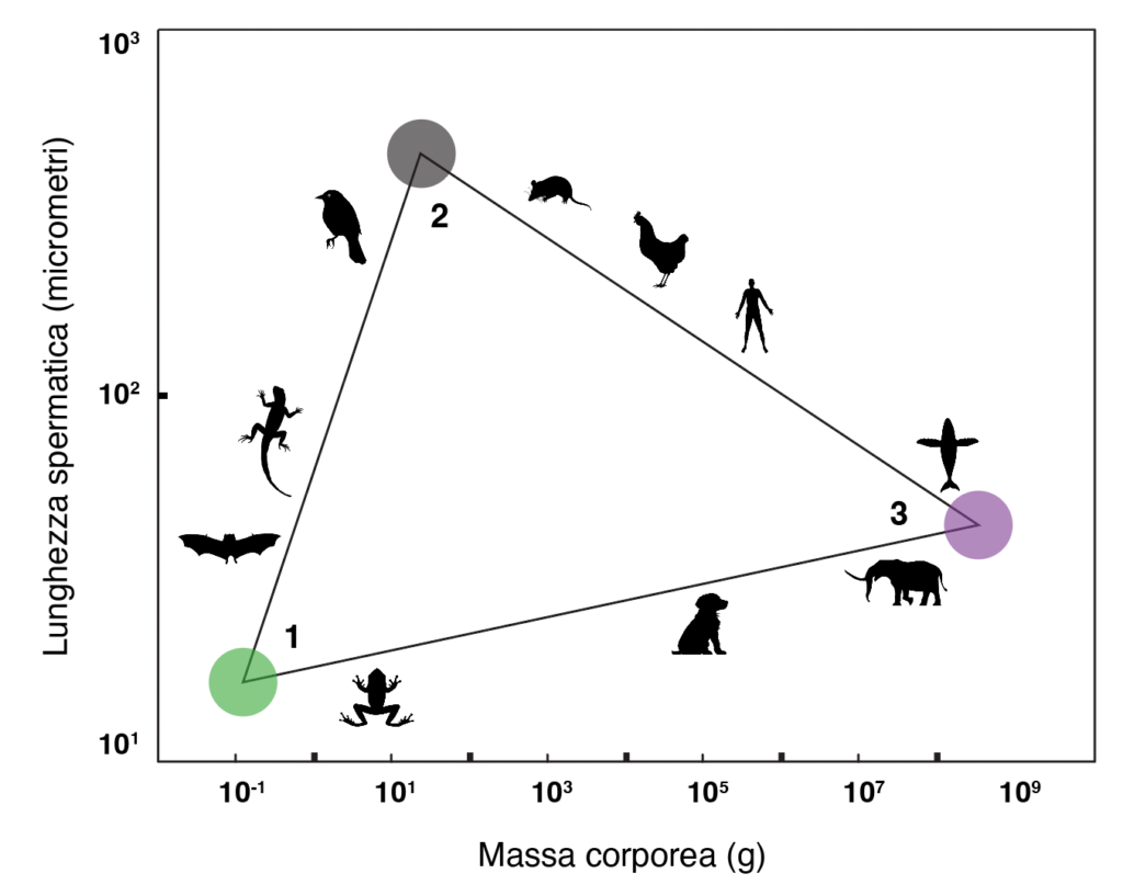 Applicando il complicatissimo sistema di analisi basato sulla multi-ottimizzazione di Pareto, il primo risultato è che non c’è una relazione lineare ma triangolare (il triangolo di Pareto) tra la lunghezza degli spermi e la massa corporea.