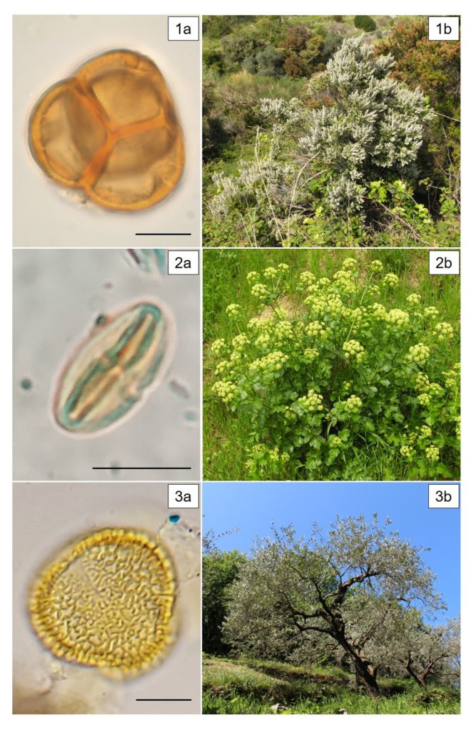 Granuli pollinici osservati al microscopio ottico con indicazione della rispettiva specie produttrice: 1) Erica arborea; 2) Apium graveolens; 3) Olea europaea. L’immagine contrassegnata con la lettera (a) mostra i granuli pollinici fotografati dal Laboratorio di Palinologia e Paleobotanica (LPP) di Modena; la barra di scala corrisponde a 10 µm. Le immagini delle piante (b) sono tratte dal sito web Dryades, Dipartimento di Scienze della Vita, Università degli Studi di Trieste, e sono state realizzate da Andrea Moro. Distribuite secondo la licenza CC-BY-SA.